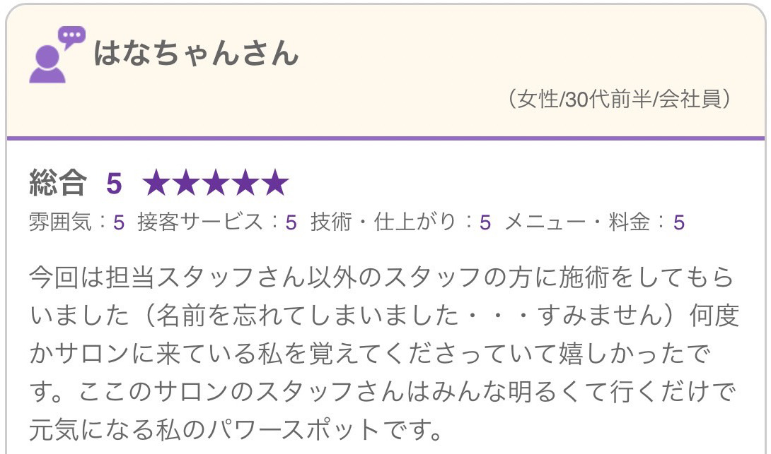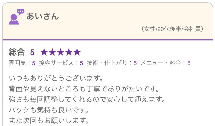 10:00~22:30 (金、土のみ 10:00~18:30) ※施術にかかる所要時間によって、 最終受付時間が異なります。 |